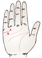 向上的斜纹(如图中A处)表婚后生活非常幸福,是吉相;反之朝下有不少斜纹(如图中B处),表示配偶婚后身体虚弱,产生夫妇间的冷淡倦怠期。